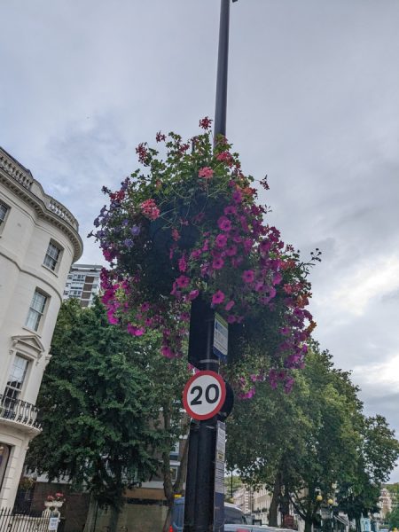 歩いてるといい匂いが。街灯の上の方をよく見ると花が植えてある。